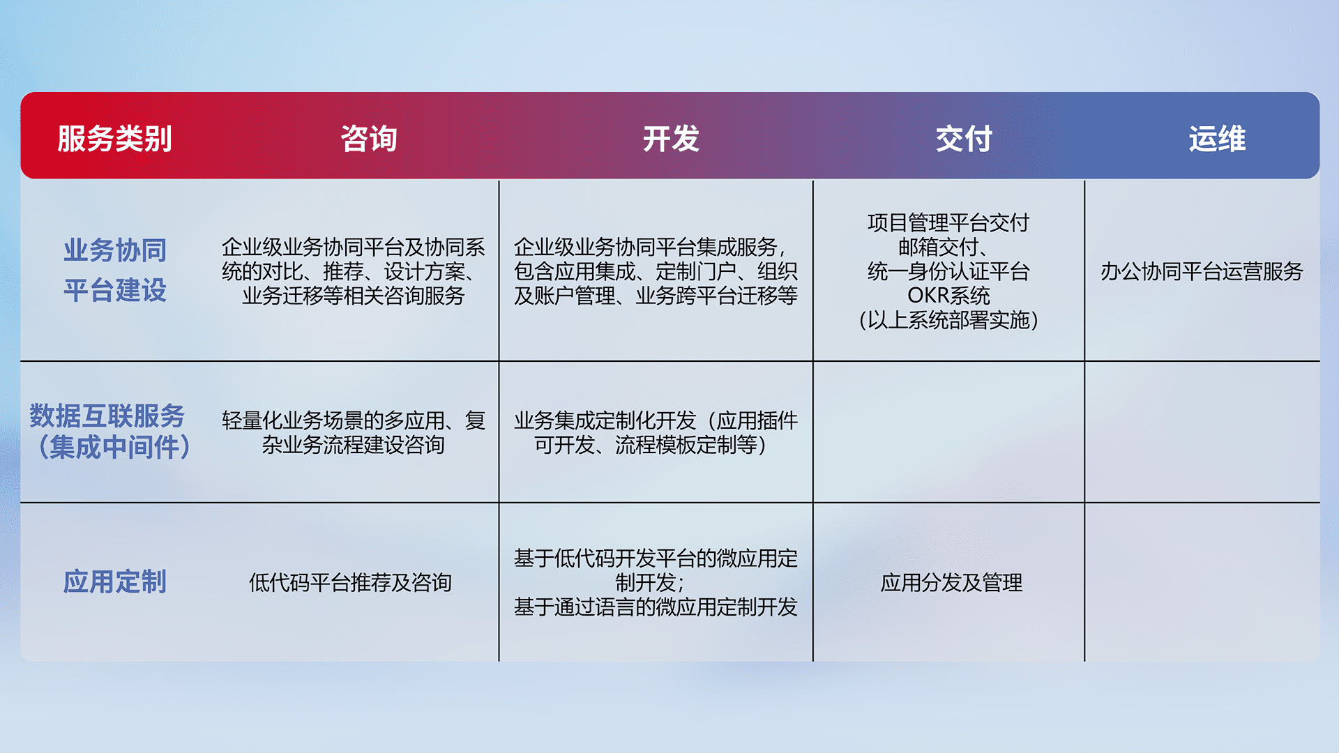 针对钉钉、、、、企微、、IDaas等平台级产品提供产品的规划、、、方案、、交付、、定制化开发等服务,,,,实现如统一协同办公、、、智能客户服务、、、混合会议管理、、智能数据查询、、、、等业务场景,,,实现数字化转型。。。。